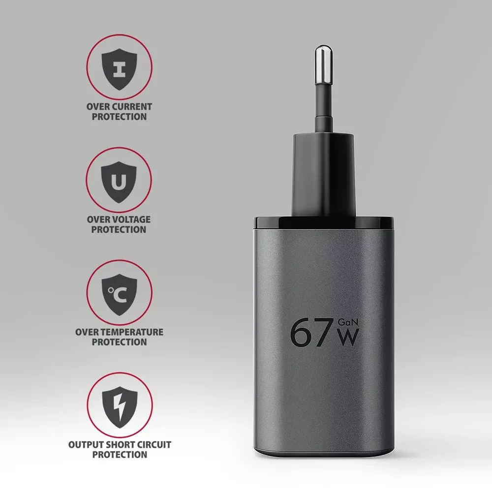 An advanced output protection system of the charging adapter protects connected devices against damage. Charger functions also ensure recognition of the connected device and selection of the optimal charging speed and process.