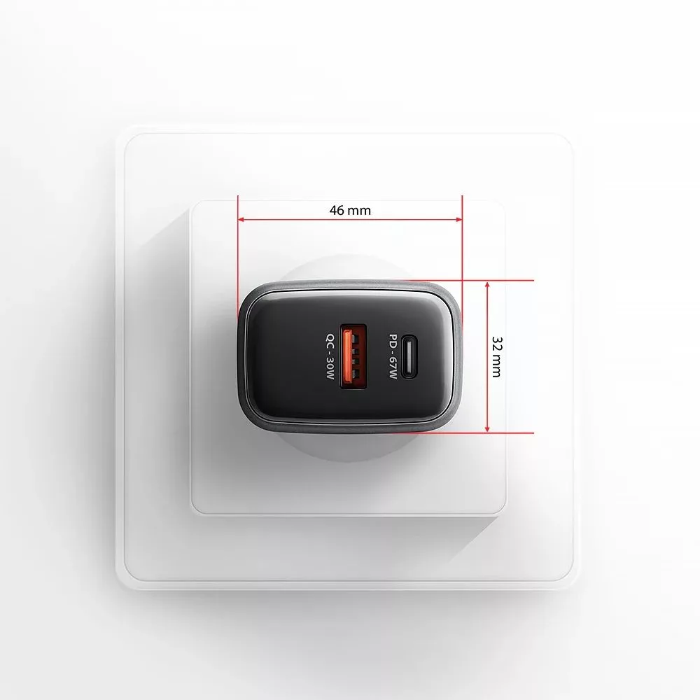 Adapter, 1xUSB-A, 1xUSB-C, 5V/9V/12V/15V/20V, 5A, 67W, QC, PD, Black