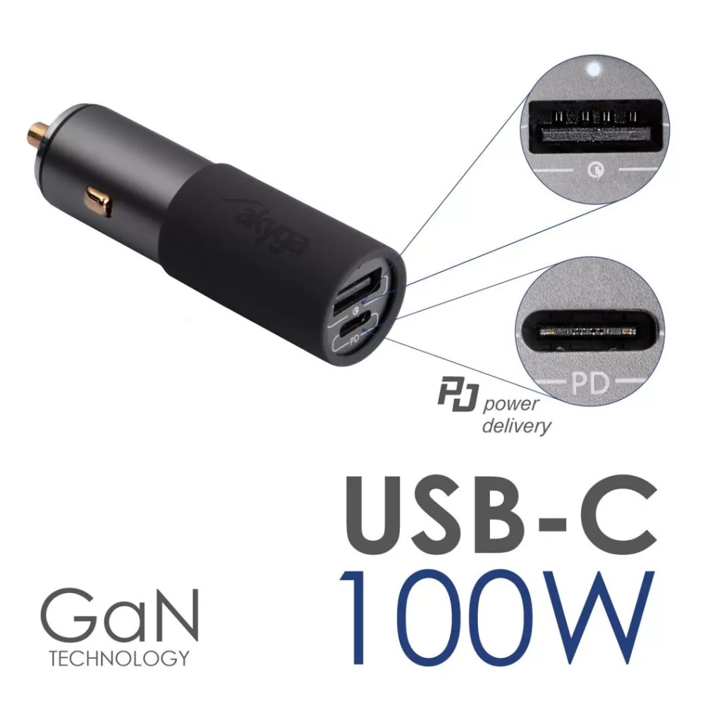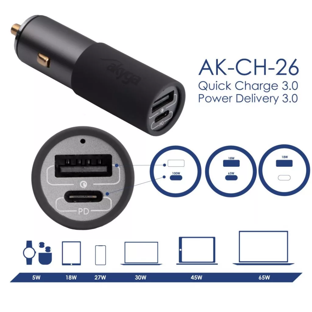 Az Akyga® AK-CH-26 USB autós töltőt a mobileszközök vezetés közbeni gyors töltésére fejlesztették ki. A GaN technológia alkalmazása nagy teljesítményt biztosít kompakt méretben. Tökéletes mind személygépkocsikhoz, mind teherautókhoz, köszönhetően annak, hogy 12 V és 24 V feszültségen is képes működni.