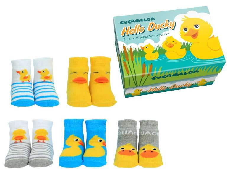 Hello Ducky - kacsa mintás 5 pár újszülött baba zokni szett.Anyag: 89% pamut, 15% poliamid, 2% elasztánBabaváró összejövetelre készülsz, de nem tudod, hogy mivel lepd meg a csöppséget? Nem szeretnél használhatatlan és felesleges dolgot venni? Akkor lepd meg az újszülöttet egy zokni szettel! Hidd el, hogy a szülei is örülni fognak, hisz zoknira mindig szüksége van egy kisbabának! Ráadásul ez a szett szuper cuki, hisz négy különböző kacsa mintás zokni található benne! Kár, hogy nincs felnőtt méretben!