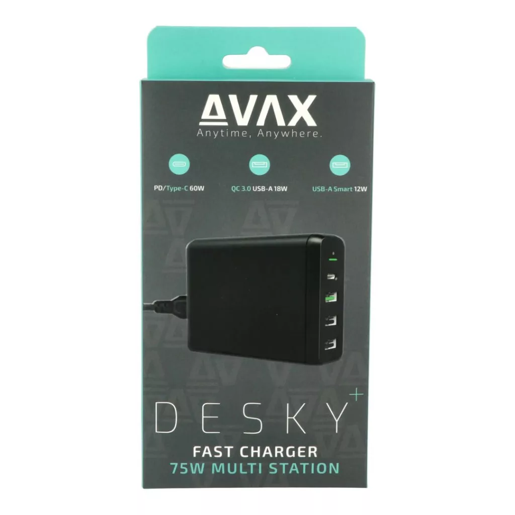 A Desky hálózati töltő teljes töltési kapacitása 75W, amely lehetővé teszi több eszköz gyors és hatékony töltését egyszerre legyen az Laptop, Tablet, Telefon vagy bármilyen okoseszköz.