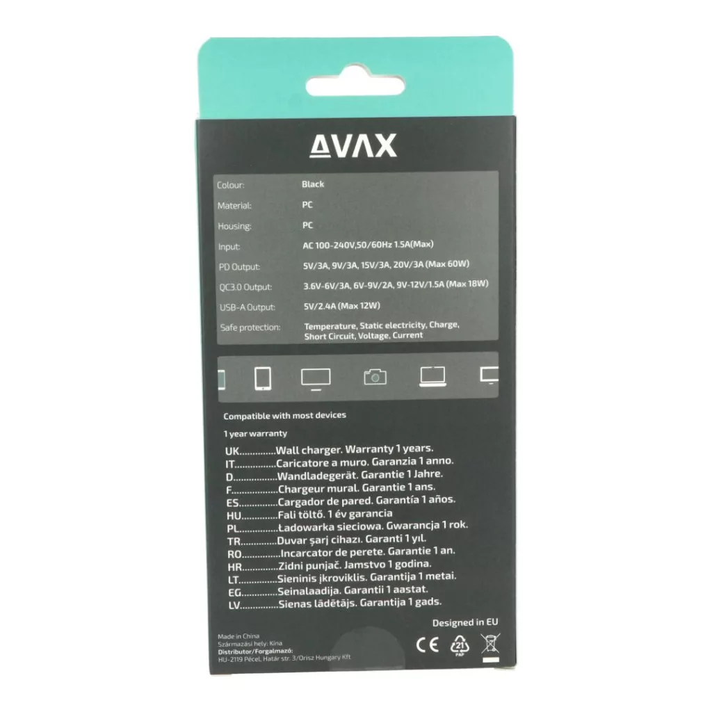 - 1 x 60W-os Type C: A 60W-os Type C port lehetővé teszi a gyors és hatékony töltést olyan eszközök számára, amelyek támogatják ezt a technológiát, így lehetőséget adva a gyorsabb teljesítésre.