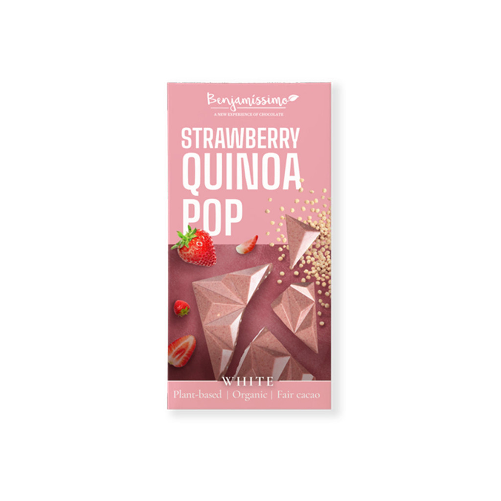 Finom rózsaszín kakaós szelet a fagyasztva szárított eper csodálatos ízével és a quinoa popcorn sima ropogásával.Összetevők: nádcukor*, kakaóvaj*, kókusztejszín*, tigrismogyoró liszt*, fagyasztva szárított eper* (3%), puffasztott quinoa* (3%), napraforgó lecitin*, természetes eper aroma. Kakaó: legalább 34%. *Biokultúrából származik.Egyéb allergén információ: Nyomokban dióféléket tartalmazhat.