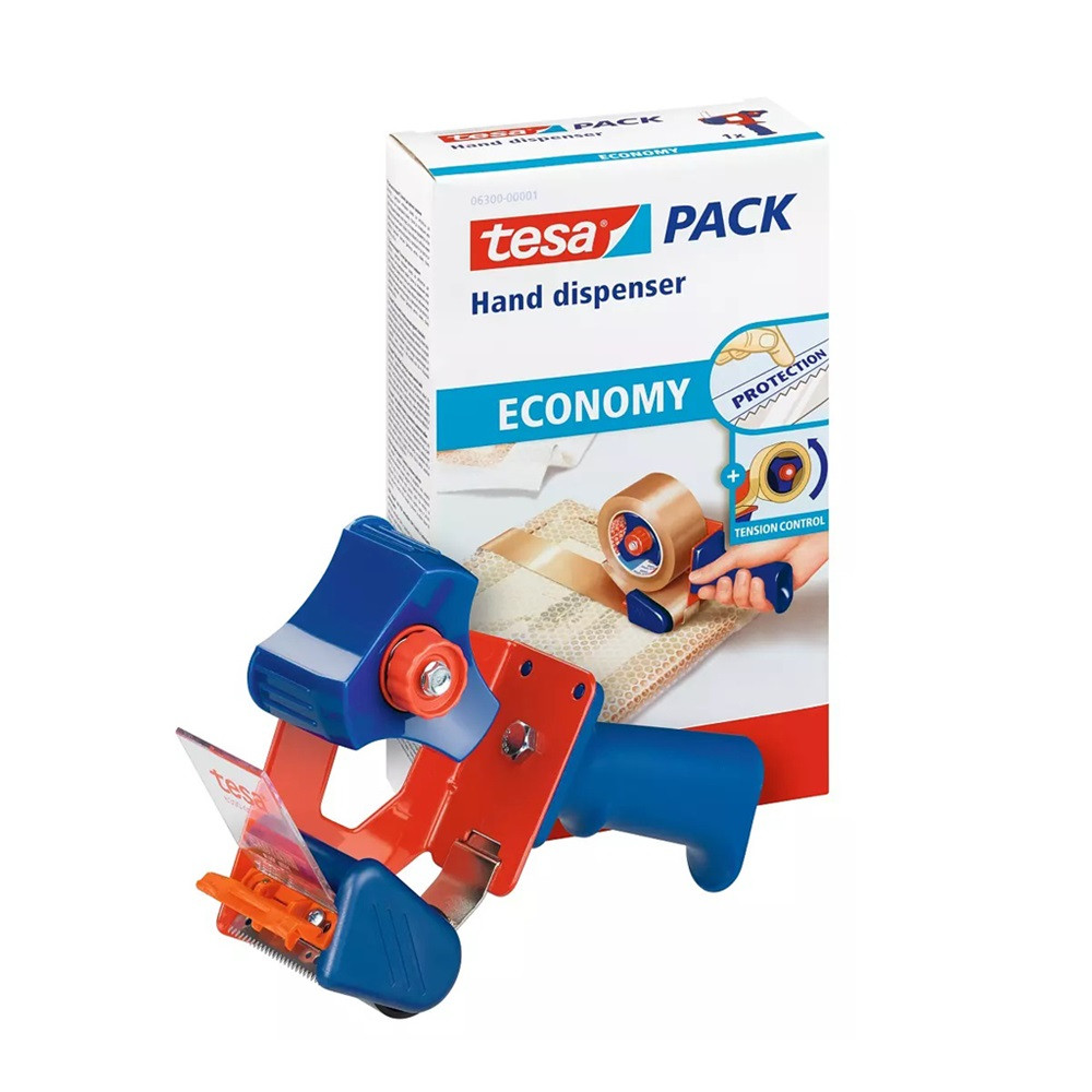 A tesa® 6300 egy költséghatékony kézi adagoló mindenfajta tesa® csomagolószalag professzionális lezárásához csomagolási és gyártási alkalmazásoknál. Az adagoló feszességszabályozóval van ellátva, hogy még a könnyen letekercselhető tesa® szalagok is problémamentesen használhatók legyenek. A pengét a sérülések megelőzésére burkolat óvja. Helyezze az adagolót a kartonra, és húzza maga felé. Az érintkezőgörgő erősen a szalagra nehezedik, amely ennek következtében leválik a tekercsről. Ha megdönti az adagolót, a fogazott penge elvágja a szalagot. A szalag elvágott végét a rugalmas leragasztólemez rányomja a kartonra. Katalóguskód: 4008