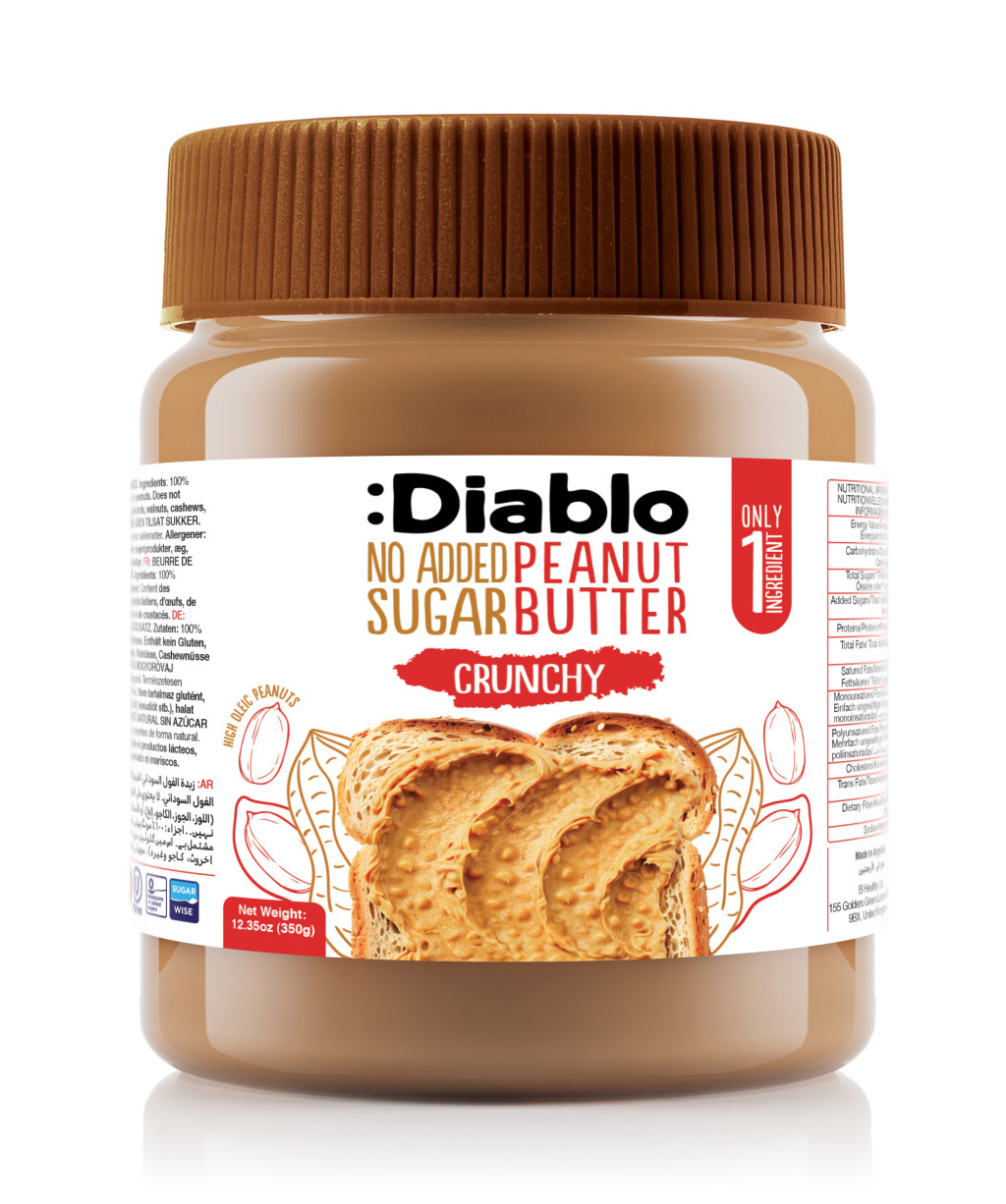 A Diablo mogyoróvaj 100%-ban pörkölt földimogyoróból készül. A benne lévő ropogós földimogyoró darabok fokozzák az ízélményt. Kiválóan kenhető. Hozzáadott cukrot, sót, pálmaolajat, tartósítószert nem tartalmaz. A természetes összetevőiben előforduló cukrokat tartalmazza.