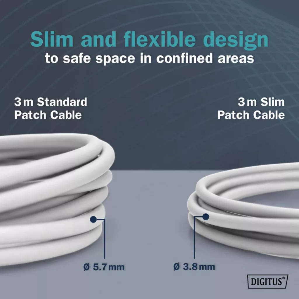A DIGITUS® Slim patch kábeleket kis külső átmérőjük és rugalmas köpenyük jellemzi. A vékony kialakítás sokoldalú felhasználást tesz lehetővé a hálózatban. A DIGITUS® Slim patchkábelek emellett az ISO/IEC 11801 és a DIN EN 50173 CAT 6A szabványoknak megfelelően készülnek. Garantálják, hogy a kábelszerelés megfelel az ISO és EN csatornaspecifikációnak, és kiváló teljesítményt nyújtanak a DIGITUS® CAT 6A kábelezésben. A teljesítményt 500 MHz-ig tesztelték, beleértve az olyan jellemzőket is, mint a közeli keresztbeszólás ("NEXT"). A DIGITUS® patch kábeleket kifejezetten úgy fejlesztették ki, hogy megfeleljenek a különböző alkalmazási területek összes követelményének. Mindegyik kábelt húzáscsökkentővel ellátott, öntött gyűrődésgátló hüvelynel látták el. Ezenkívül a hüvelyben van egy reteszelőkar-védelem, amely megakadályozza, hogy a kábel elgörbüljön, és a reteszelőkar letörjön a dugóról.
