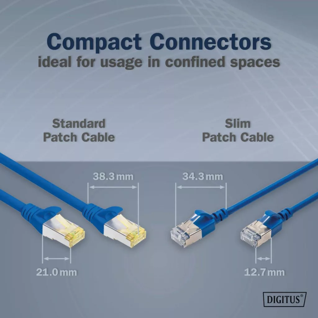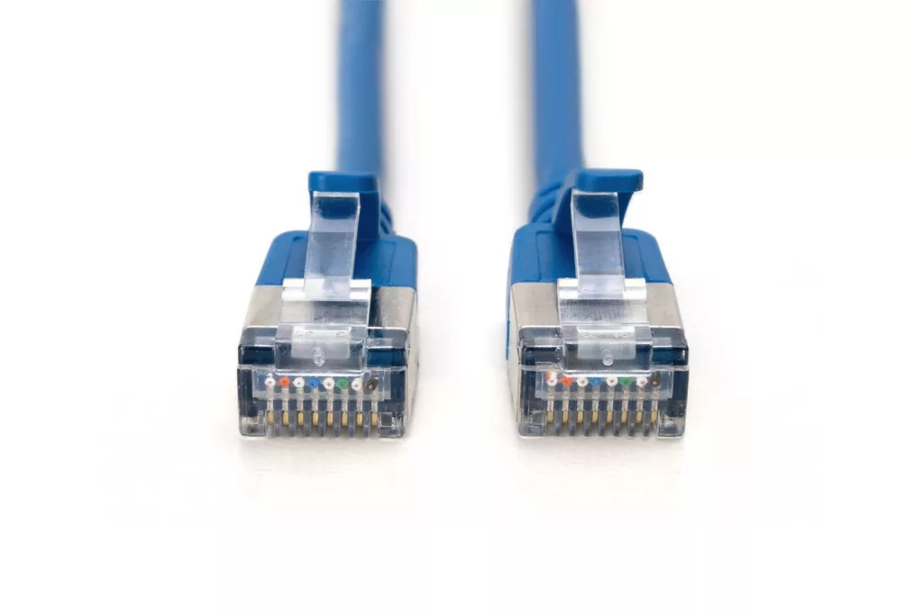 A DIGITUS® Slim patch kábeleket kis külső átmérőjük és rugalmas köpenyük jellemzi. A vékony kialakítás sokoldalú felhasználást tesz lehetővé a hálózatban. A DIGITUS® Slim patchkábelek emellett az ISO/IEC 11801 és a DIN EN 50173 CAT 6A szabványoknak megfelelően készülnek. Garantálják, hogy a kábelszerelés megfelel az ISO és EN csatornaspecifikációnak, és kiváló teljesítményt nyújtanak a DIGITUS® CAT 6A kábelezésben. A teljesítményt 500 MHz-ig tesztelték, beleértve az olyan jellemzőket is, mint a közeli keresztbeszólás ("NEXT"). A DIGITUS® patch kábeleket kifejezetten úgy fejlesztették ki, hogy megfeleljenek a különböző alkalmazási területek összes követelményének. Mindegyik kábelt húzáscsökkentővel ellátott, öntött gyűrődésgátló hüvelynel látták el. Ezenkívül a hüvelyben van egy reteszelőkar-védelem, amely megakadályozza, hogy a kábel elgörbüljön, és a reteszelőkar letörjön a dugóról.