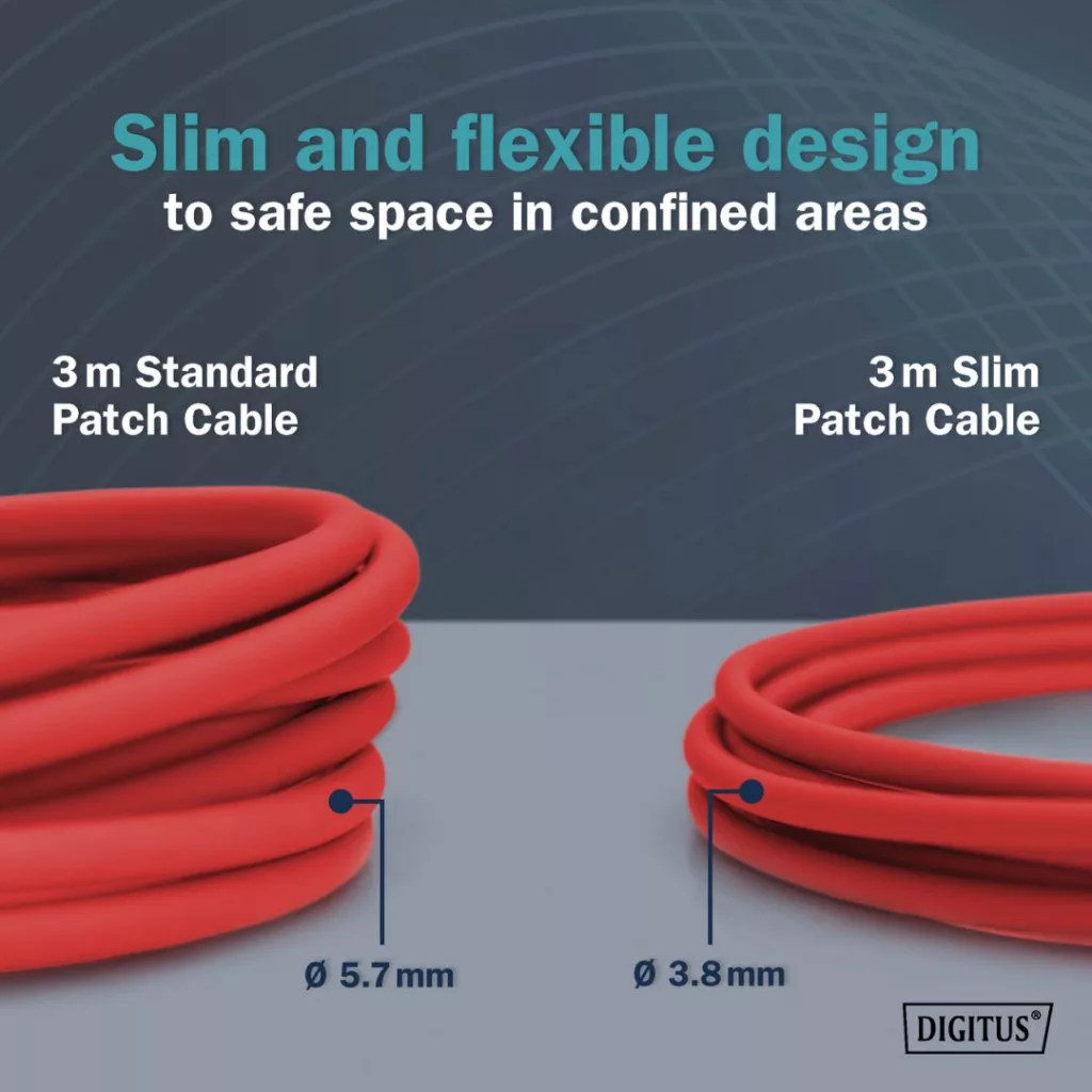 A DIGITUS® Slim patch kábeleket kis külső átmérőjük és rugalmas köpenyük jellemzi. A vékony kialakítás sokoldalú felhasználást tesz lehetővé a hálózatban. A DIGITUS® Slim patchkábelek emellett az ISO/IEC 11801 és a DIN EN 50173 CAT 6A szabványoknak megfelelően készülnek. Garantálják, hogy a kábelszerelés megfelel az ISO és EN csatornaspecifikációnak, és kiváló teljesítményt nyújtanak a DIGITUS® CAT 6A kábelezésben. A teljesítményt 500 MHz-ig tesztelték, beleértve az olyan jellemzőket is, mint a közeli keresztbeszólás ("NEXT"). A DIGITUS® patch kábeleket kifejezetten úgy fejlesztették ki, hogy megfeleljenek a különböző alkalmazási területek összes követelményének. Mindegyik kábelt húzáscsökkentővel ellátott, öntött gyűrődésgátló hüvelynel látták el. Ezenkívül a hüvelyben van egy reteszelőkar-védelem, amely megakadályozza, hogy a kábel elgörbüljön, és a reteszelőkar letörjön a dugóról.