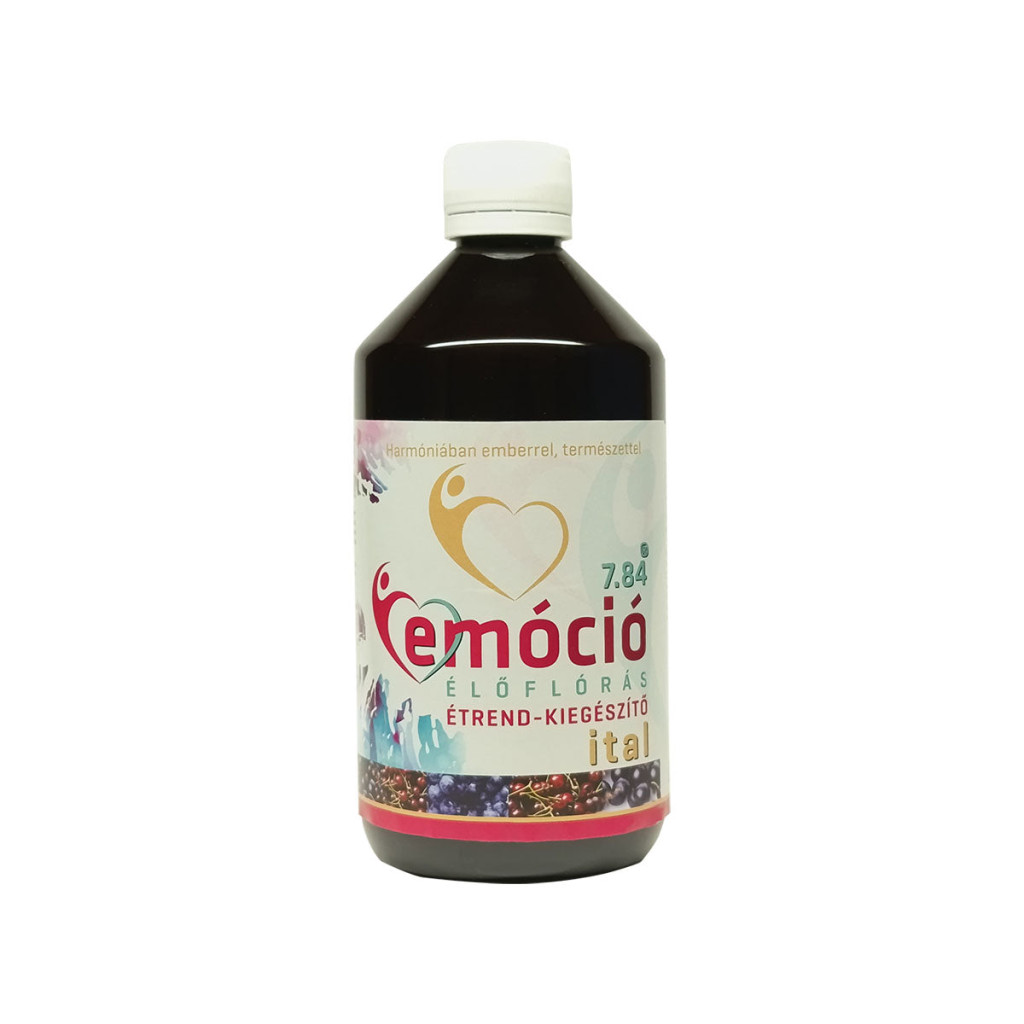 Az emóció 7.84 egyedülálló, fermentált, élőflórás ital effektív mikroorganizmusokkal, valamint értékes, közismerten antioxidáns tulajdonságú meggy-, kékszőlő- és fekete ribizli gyümölcskivonatokkal, kizárólag természetes összetevőkből készült étrend-kiegészítő ital. Hatóanyag/30ml:Baktérium fermentum: 7 x 10^8 ,antioxidánsokÖsszetevők: Baktérium fermentum (94,0 % tisztított víz; 3,0 % cukornád melasz; 3,0 % oltófermentum (Lactobacillus lactis, Lactobacillus plantarum, Saccharomyces cerevisiae),feketeribizli-,meggy- és kékszőlő lé koncentrátumAdagolás: napi 30mlFigyelmeztetés: Az étrend-kiegészítő nem helyettesíti a kiegyensúlyozott,vegyes étrendet és az egészséges életmódot.Átlagos tápérték 100g termékben:Energia: 41kj/100ml; 10kcal/100mlZsír: <0,2g/100ml Amelyből telített zsírsavak: 0gSzénhidrát: <1g/100ml Amelyből cukrok: <0,1g/100ml Fehérje: 0,6g/100ml Rost: 0g Só: 0,012g/100ml