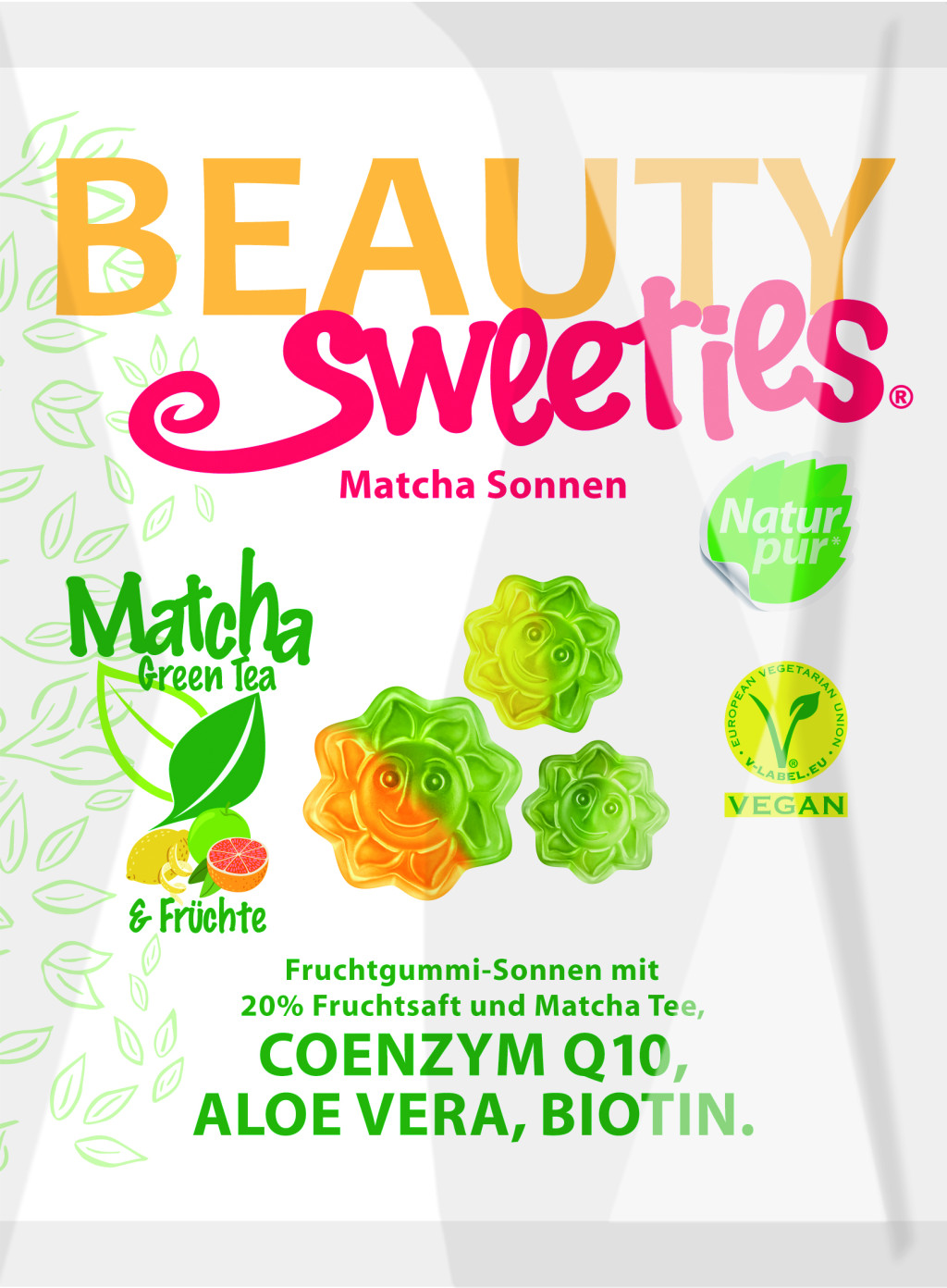 Élvezd a Beauty Sweeties gumicukrok legújabb változatát, a gyümölcsös napocskákat 20 % gyümölcslével, matcha teával, Q10-koenzimmel, aloe verával és biotinnal.