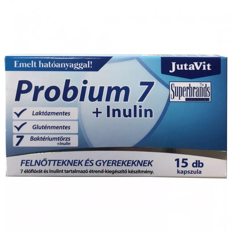 A JutaVit Probium 7 + Inulin termék laktóz- (tejcukor), tejfehérje- és tejmentes, gluténmentes, szójamentes, vegetáriánus termék. Bélflóránk egyensúlyát számos külső hatás felboríthatja. Ilyenkor a bélbaktériumok egy része elpusztulhat. Antibiotikumos kezelés étrendi kiegészítése esetén a készítményt az antibiotikum bevételét követően minimum két óra elteltével alkalmazza. A termék hozzáadott inulint tartalmaz. Az inulin természetes vízben oldódó rost amely emésztetlenül jut a vastagbélbe.