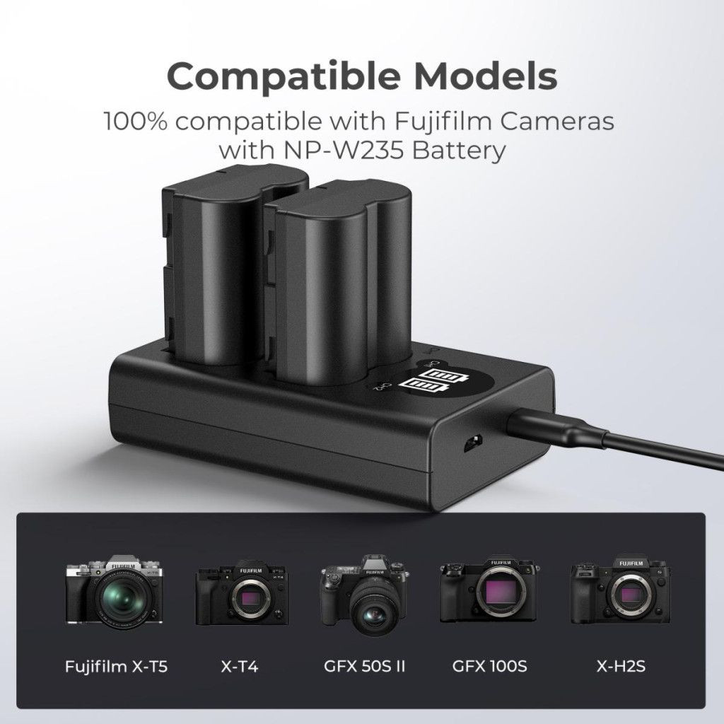 - Kompatibilitás: Fujifilm X-T4, X-T5, X-H2, X-H2S, GFX100S, GFX50S II és más NP-W235-kompatibilis modellek