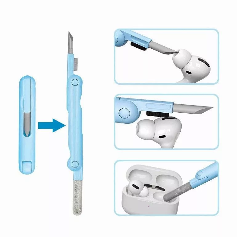 A praktikus, összecsukható fülhallgatótisztító eszköz szilikonheggyel, puha pelyhesítő szivaccsal és kefével rendelkezik