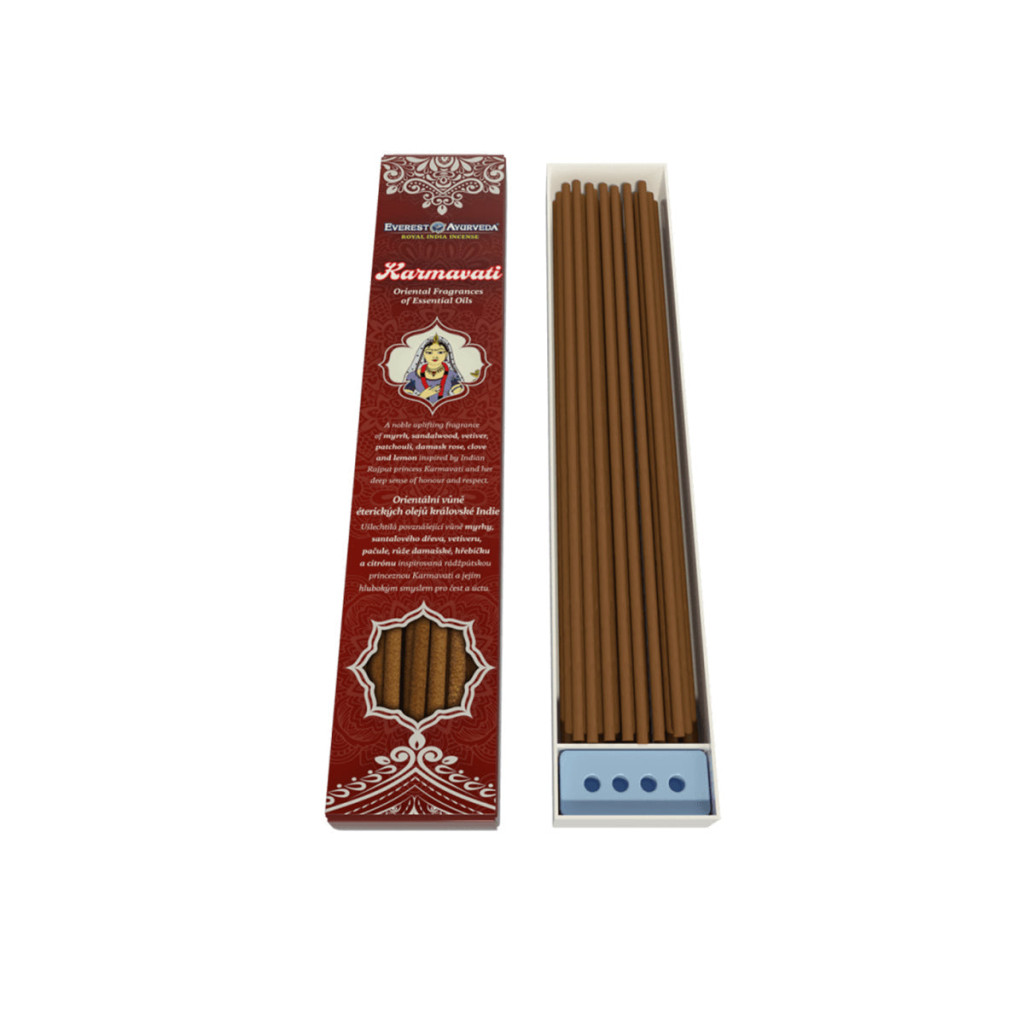 A mirha, szantálfa, vetiver, pacsuli, damaszkuszi rózsa, szegfűszeg és a citrom nemes, felemelő illata, amelyet Karmavati rádzsput hercegnő, valamint mély becsülete és tisztelete ihletett. Bambuszrúd nélküli füstölők. 100%-ban természetes összetevőket tartalmaznak kémiai adalékanyagok és mesterséges parfümök nélkül. Használati javaslat: Helyezze a füstölőt az állványba. Meggyújtás után 10 másodpercen belül oltsa el a lángot, és győződjön meg arról, hogy az összes hamu nem gyúlékony felületre hulljon. Amíg a füstölő parázslik, legyen figyelmes Figyelmeztetés: Ingredients: litsea glutinosa (indiai babér), cinnamomum tamala (fahéj tamala), santalum album (fehér szantálfa) és illóolajok keveréke: commiphora myrrha (igazi mirha), vetiveria zizanioides (vetiver), pogostemon cablin (közönséges pacsuli), rosa damascena (damaszkuszi rózsa), eugenia caryophyllus (szegfűszeg), citrus limon