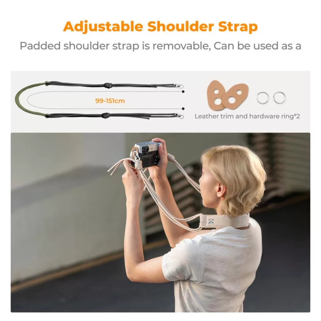 【Mellékelt bőrtapasz és fémgyűrű】Szintén használható külön fényképezőgép vállpántként a további funkcionalitás érdekében.