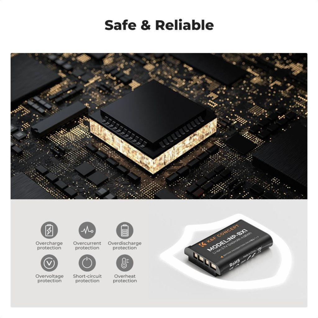 A K&F Concept NP-BX1 akkumulátor és töltő szett egy megbízható és hosszú üzemidőt biztosító megoldás, amely kompatibilis a Sony ZV-1, ZV-1F, DSC-RX100 sorozat és több Sony fényképezőgéppel. A csomag két nagy kapacitású 1240mAh akkumulátort és egy kompakt, USB-C csatlakozású kétrekeszes töltőt tartalmaz, így biztosítva a folyamatos energiaellátást fotózások és videózások során.