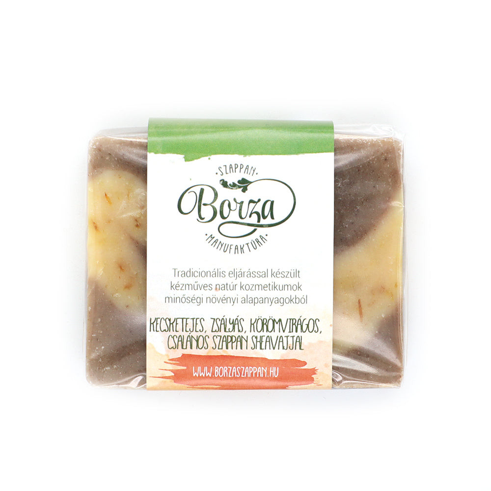 Gyógynövényes szappant szerettem volna készíteni, de arra jutottam, miért csak egy fajta gyógynövény kerüljön bele. Hosszas keresgélés után mindjárt háromra esett a választásom: Csalán, körömvirág és zsálya mellett tettem le a voksomat. Zsályát már az ókori görögök és rómaiak is ismerték, melyre latin neve is utal. Salvia magyarul annyit tesz: 'gyógyítani'. Csökkenti a gyulladást, izzadást. Összehúzó és antibiotikus hatása is van. Jótékonyan hat a pikkelysömör okozta gyulladásoknál és más egyéb bőrbetegségeknél, csökken a viszkető, égető érzés is általa. Fiatalosan tartja a bőrt, szabályozza a faggyúkiválasztást, ezáltal csökkentve a pattanásosodást. Körömvirágolaj és körömvirág szirmokból készült főzet gondoskodik a bőr gyulladásos folyamatainak mérsékléséről és a sebek gyógyulási folyamatainak felgyorsításáról. Ez a szappan nagyszerű gyógyír ekcémás, pattanásos, bőrgyulladásos tünetekre. Csalán párját ritkító vitamin és ásványanyag tartalommal rendelkezik. Belőle készült termékek alapos bőrtisztító tulajdonságúak, sőt különösen jó hatással vannak a zsíros bőrre. Ha megfigyeljük magas A és C-vitamin és szelén tartalmát, azt tapasztaljuk,hogy a kecsketejjel tökéletesen együttműködnek bőrünk gyengéd tisztítása, valamint ápolása érdekében. Sőt kovasav tartalma még a kötőszöveteket is erősíti. A szappan színét az extra szűz olívaolajban érlelt csalán, körömvirág és zsálya természetes színe határozza meg. Hozzáadott illatanyagot nem tartalmaz, a gyógynövények enyhe, nem tolakodó illata fedezhető fel ebben a szappanban. Használati javaslat: Egyenletesen vidd fel a szappant megnedvesített bőrödre, habosítsd, majd alaposan öblítsd le! Ügyelj, hogy a hab ne kerüljön a szemedbe! Használat után tedd a szappantartóra, így sokáig kitart! Figyelmeztetés: Ingredients: extra szűz olívaolaj (olea europaea fruit oil),kókuszolaj (cocos nucifera oil),víz (aqua),lúg (sodium hydroxide),sheavaj (butyrospermum parkii butter),kecsketejpor (caprae lac powder),méz (honey),orvosi zsálya (salvia sclarea leaf powder)csalán por (urtica dioica leaf powder)körömvirág (calendula officinalis flower powder)