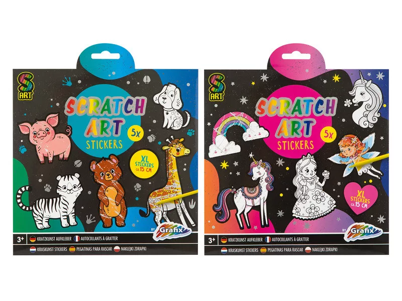 Képkarcoló matricák, 5 db/csomag, kaparó tollal, 2 féle