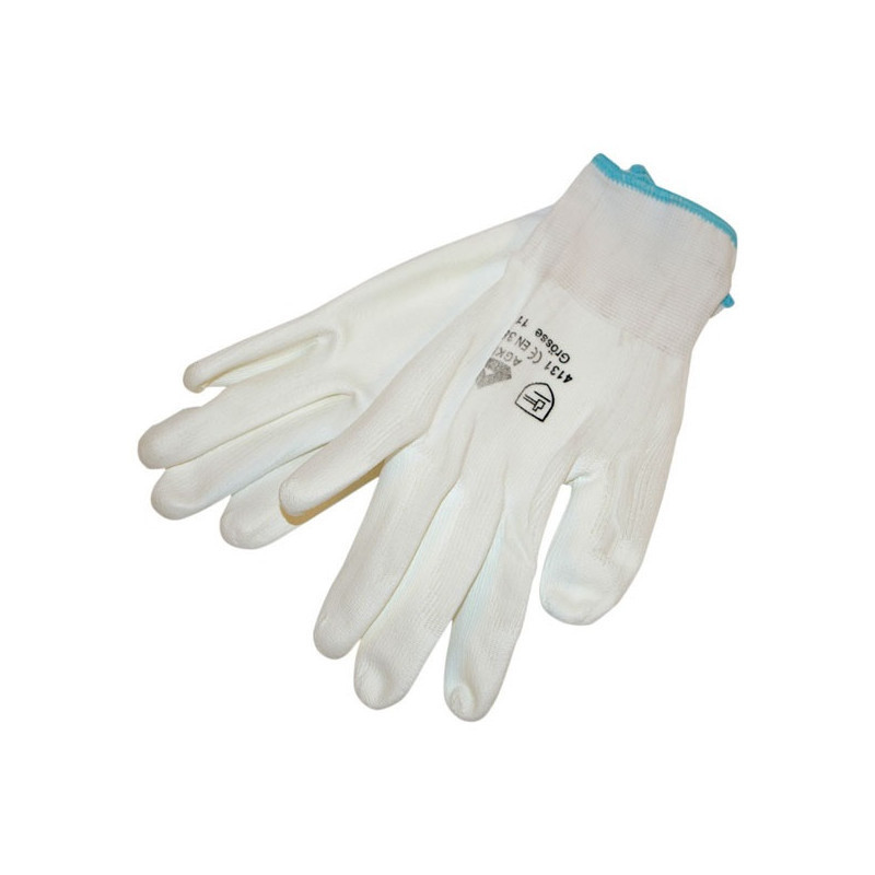 Kötött kesztyű fehér nylon poliuretánba mártott tenyérrésszel és ujjhegyekkel, gumírozott mandzsettával Egyarant alkalmas száraz és nedves alkatrészek kezeléséhez. Alkalmazási területek: