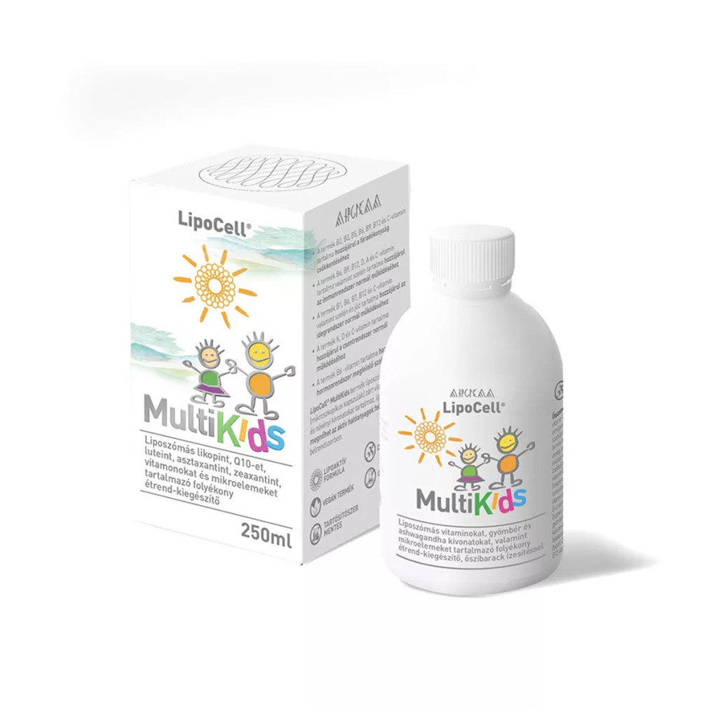 A LipoCell MultiKids egy speciálisan gyermekek számára kifejlesztett, liposzómás technológiával készült folyékony étrend-kiegészítő, amely ízletes őszibarack ízével és hatékony összetevőivel segíti a fejlődő szervezet immunrendszerét és vitalitását. A termék tartalmazza a legfontosabb vitaminokat, ásványi anyagokat, valamint gyömbér- és ashwagandha-kivonatokat, amelyek együttesen járulnak hozzá a gyermekek egészségéhez, energiaszintjük fenntartásához és stressztűrő képességük növeléséhez.Összetevők: Támogasd gyermeked egészségét a LipoCell MultiKids liposzómás étrend-kiegészítővel! Ez az ízletes, őszibarack ízű folyadék liposzómás vitaminokat, gyömbér- és ashwagandha-kivonatokat, valamint létfontosságú mikroelemeket tartalmaz, amelyek segíthetnek csökkenteni a fáradtságot és erősíteni az immunrendszert. A liposzómás technológia révén a hatóanyagok hatékonyabban szívódnak fel, biztosítva a maximális támogatást gyermeked fejlődéséhez. Cukormentes, vegán és tartósítószer-mentes formula, amely 3 éves kortól adható. Válaszd a LipoCell MultiKids-et, és biztosítsd gyermeked számára a szükséges vitaminokat és ásványi anyagokat egy finom és könnyen fogyasztható formában!Adagolás: Fogyassz naponta 5 ml-t, amelyet közvetlenül vagy vízzel, gyümölcslével hígítva adhatsz gyermekednek.Figyelmeztetés: