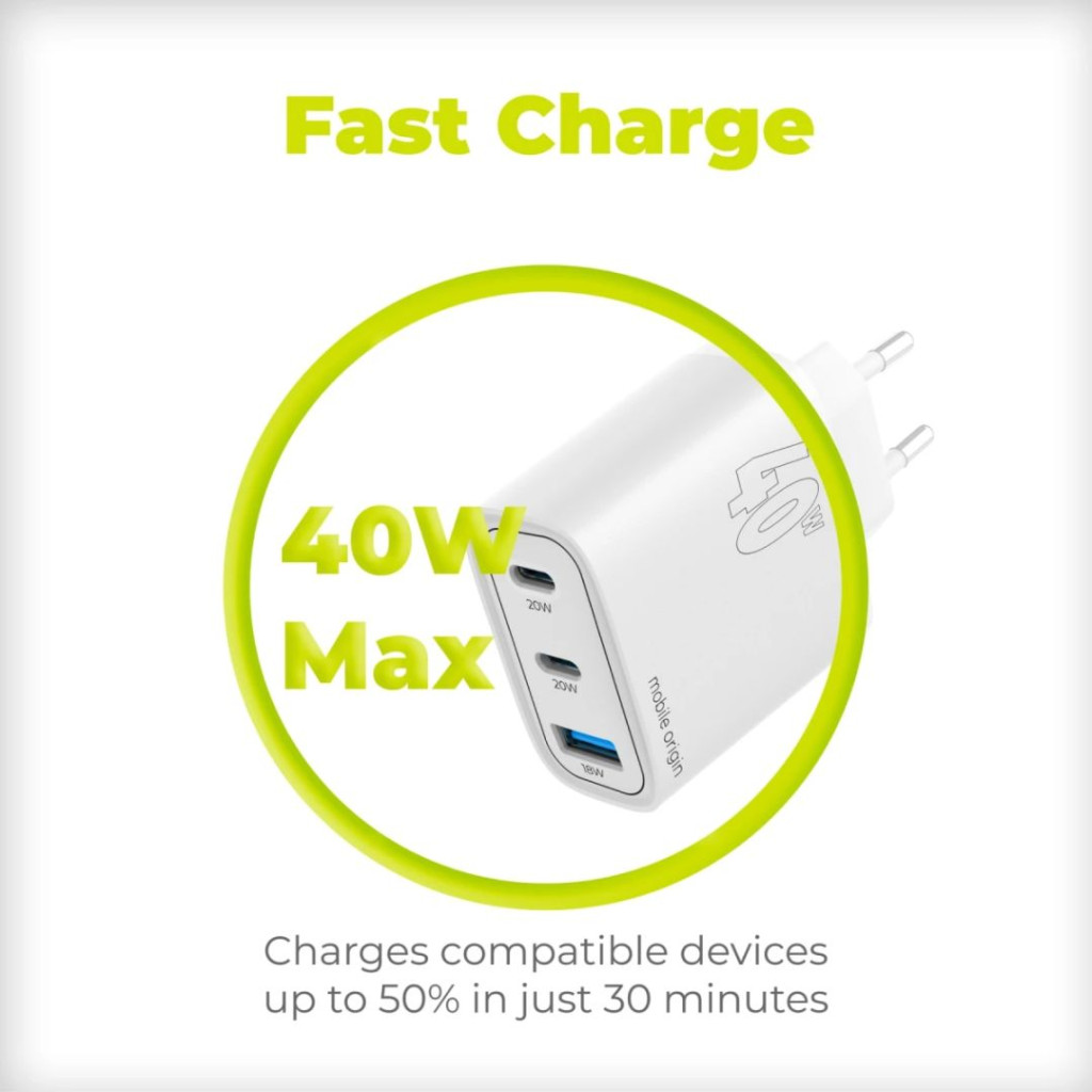40 W-os gyorstöltés a legújabb GaN technológiával, elegáns, kompakt kivitelben. Egyszerre akár 3 készüléket is tölthet a 2x USB-C és 1x USB-A porttal. Ideális otthoni vagy utazáshoz, gyorsaságot, biztonságot és hordozhatóságot biztosít, bárhová is megy.