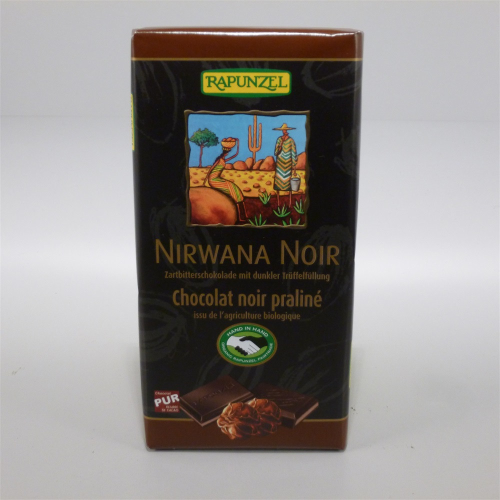 NIRWANA NOIR Töltött csokoládé keserű töltelékkel. Összetétel barna nádcukor*, kakaómassza*, mogyoró* 19,7, kakaóvaj,* kakaópor*, bourbon vanília* - *= ellenőrzött ökológiai gazdálkodásból.