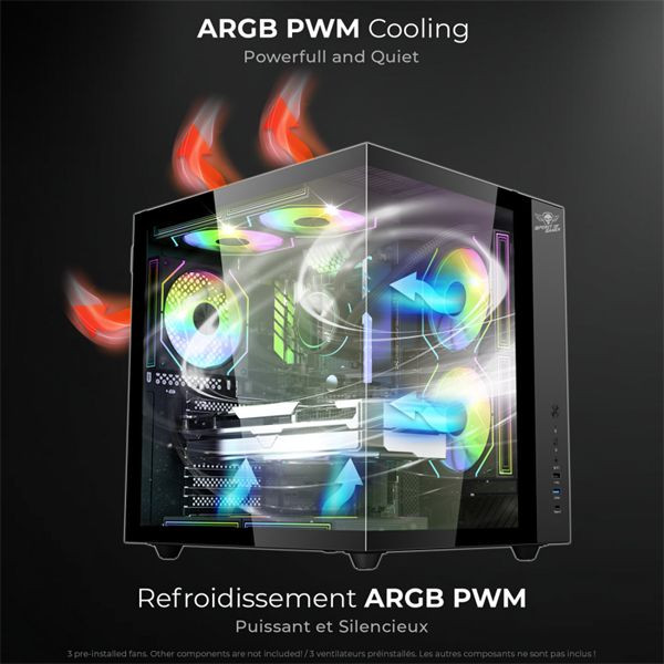 ATX, Black, 1x3,5", 2x2,5", 1xUSB2.0, 1xUSB3.0, 1xUSB Type-C, Audio, Táp nélkül, 416x407x354mm, Ventilátor:3x12cm, Tempered glass window, RGB, Gamer