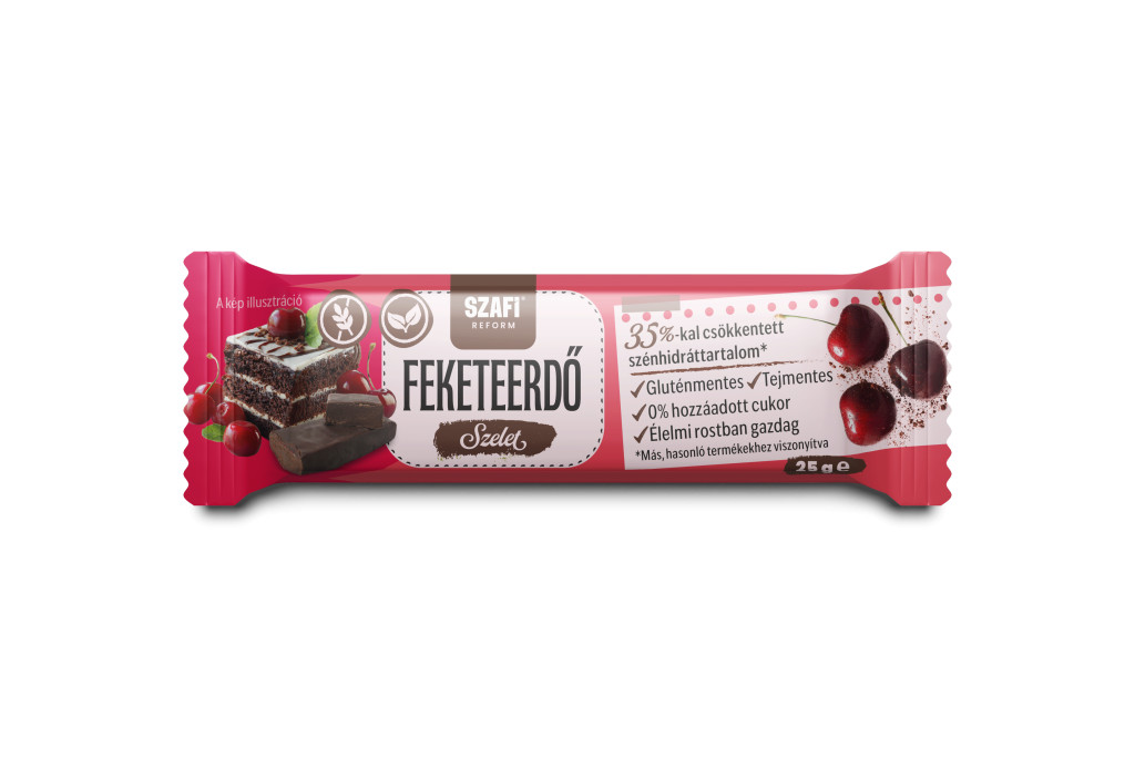 Feketeerdő szelet étcsokoládéba (20%) mártva, édesítőszerekkel