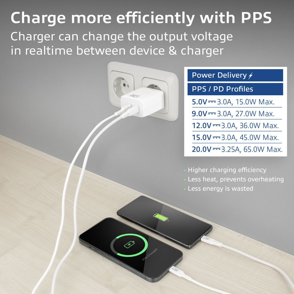 Az AC2165 töltő támogatja a Power Delivery PPS (programozható tápellátás) funkciót. A PPS további töltési profilok hozzáadásával biztosítja a készülék leghatékonyabb töltését. A töltés dinamikusan igazodik a készülék igényeihez. A hatékony töltés kevesebb hőt termel és meghosszabbítja az akkumulátor élettartamát.