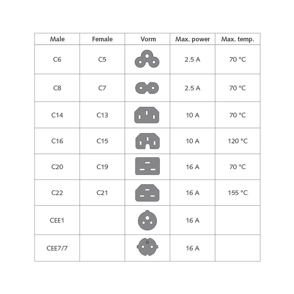 A C20 - C21 tápkábel nagy teljesítményű berendezések, például a leggyakrabban használt márkák szervereinek táplálására szolgál. A C21 csatlakozó 155°-ig magas hőmérsékletnek felel meg. Az