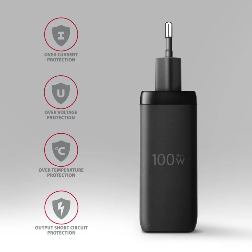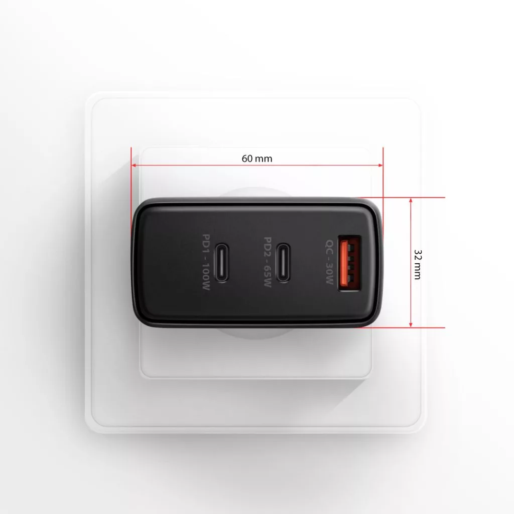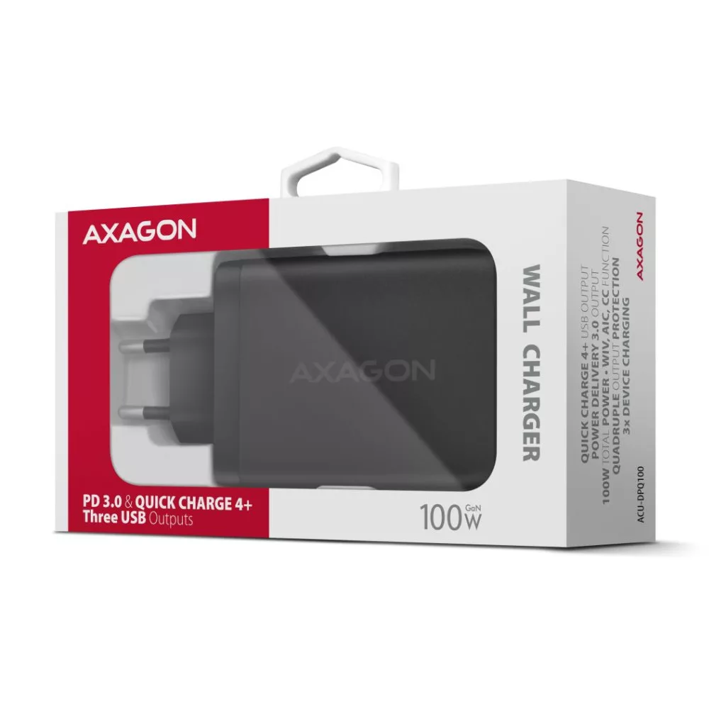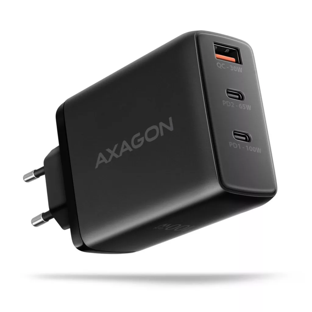 Utazó fali töltő AXAGON ACU-DPQ100 GaN egyszerre akár három mobileszköz gyors töltéséhez. A 100W összteljesítménnyel a töltő a lehető legnagyobb sebességgel tölti a notebookokat, telefonokat és más mobileszközöket. Az adapter egy szabványos USB-A csatlakozóval, de két kétoldalas USB-C csatlakozóval is rendelkezik.