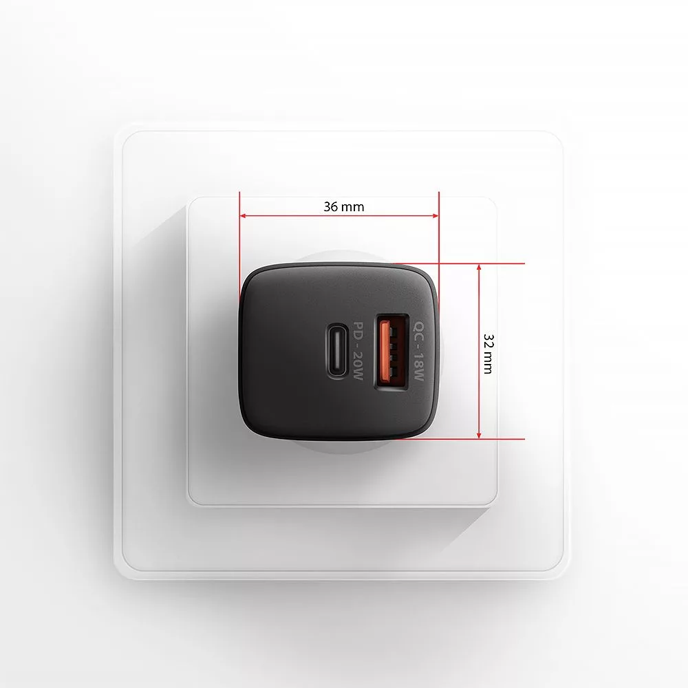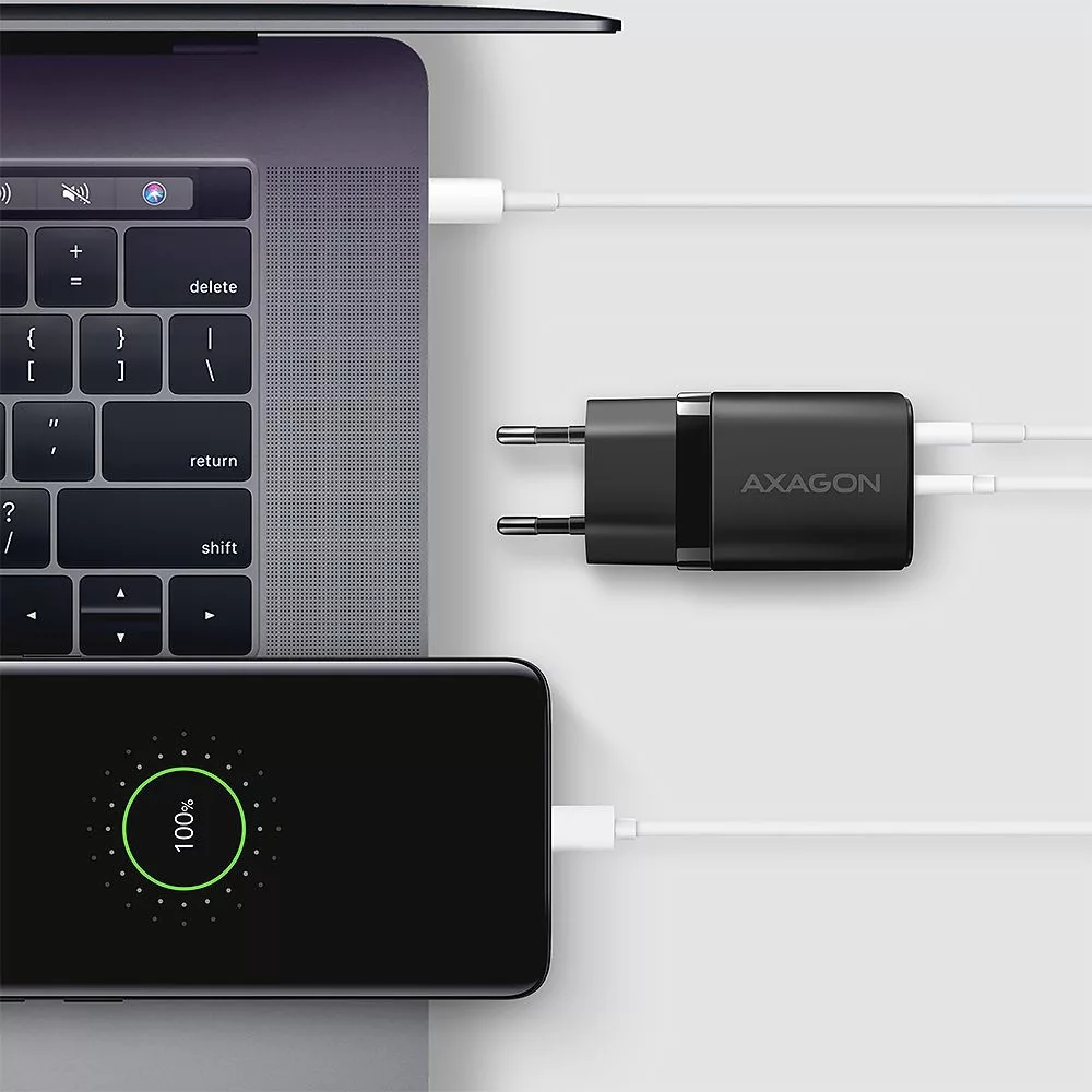 A kompakt AXAGON ACU-PQ20 hálózati töltő akár két mobileszköz egyidejű gyors töltését teszi lehetővé. A 20W összteljesítménnyel a töltő a lehető legnagyobb sebességgel tölti a telefonokat, táblagépeket és más mobileszközöket. Az adapter egy szabványos USB-A csatlakozóval, de kétoldalas USB-C csatlakozóval is rendelkezik.