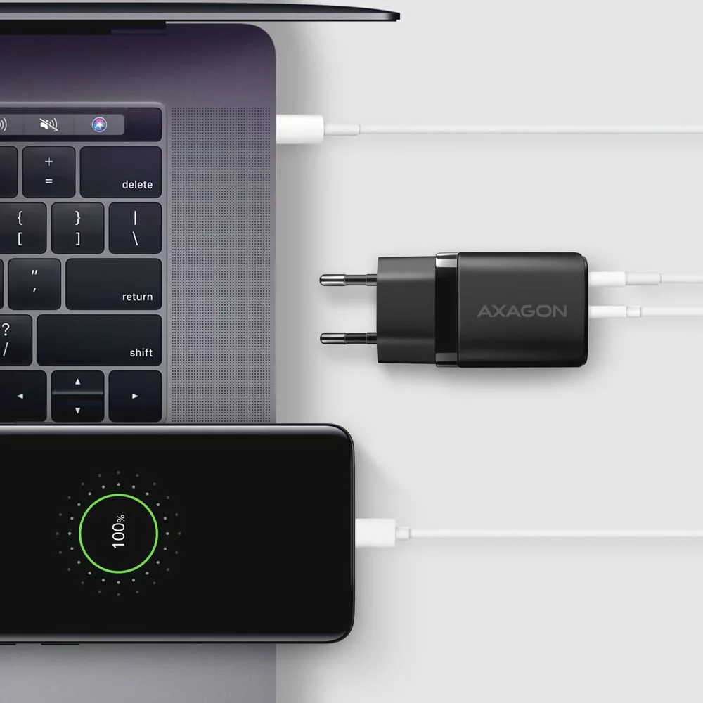 Kompakt USB fali töltő AXAGON ACU-PQ30 Sil egyszerre akár két mobileszköz gyors töltéséhez. A 30W összteljesítménnyel a töltő a lehető legnagyobb sebességgel tölti a telefonokat és más mobileszközöket Az adapter egy szabványos USB-A csatlakozóval, de kétoldalas USB-C csatlakozóval is rendelkezik.