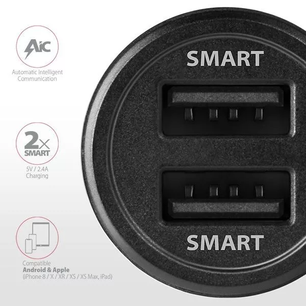 Autós töltő, 2xUSB-A, 5V, 2,4A, 24W, Black