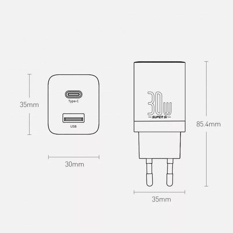 Adapter, 1xUSB-A, 1xUSB-C, 5V/9V/12V/15V/20V, 3A, 30W, QC, PD, Black