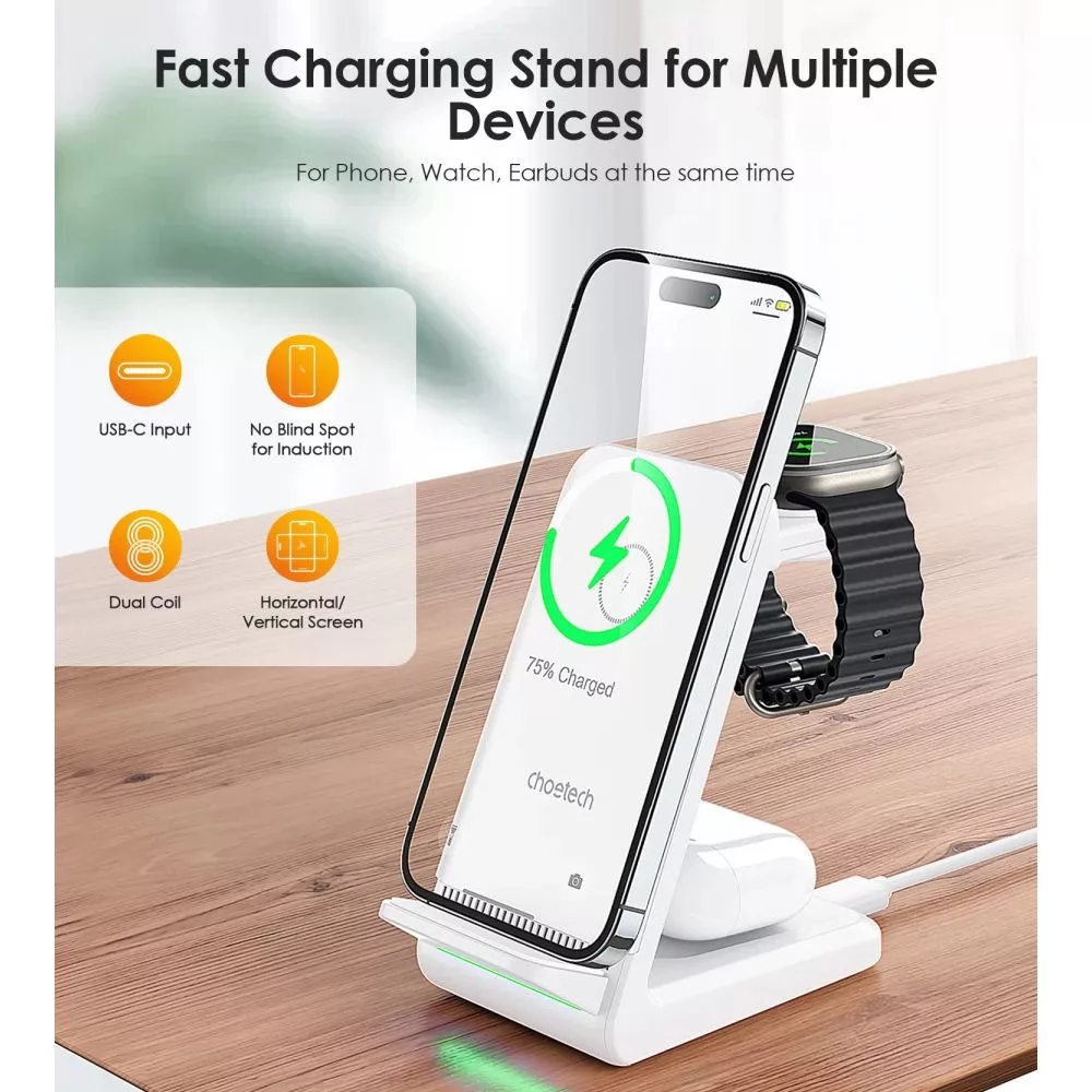 A Choetech T608 egy átfogó megoldás minden mobileszközéhez - okostelefonokhoz, okosórákhoz és fejhallgatókhoz. Állványként is használható.