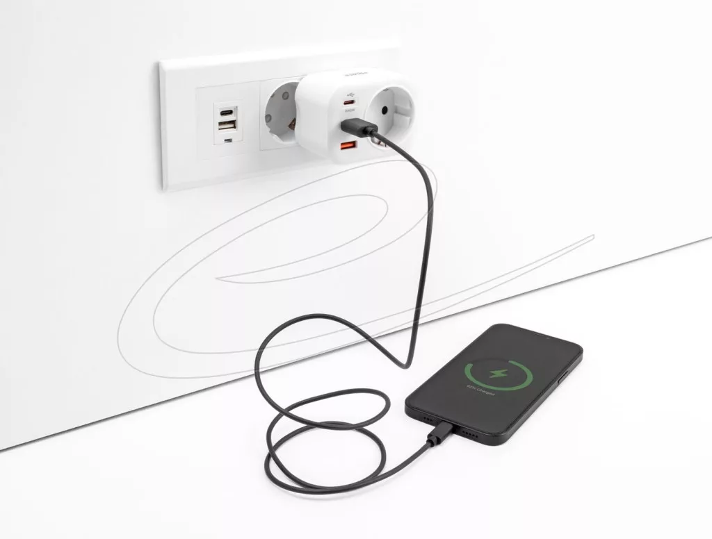 Ez a Delock tápcsatlakoztató rendelkezik egy USB Type-C és két A-típusú USB töltő portot. Az USB töltő portok támogatják az átlagos gyorstöltő módozatokat. A csatlakoztatott eszközök akár 20 W-tal is tölthetők.