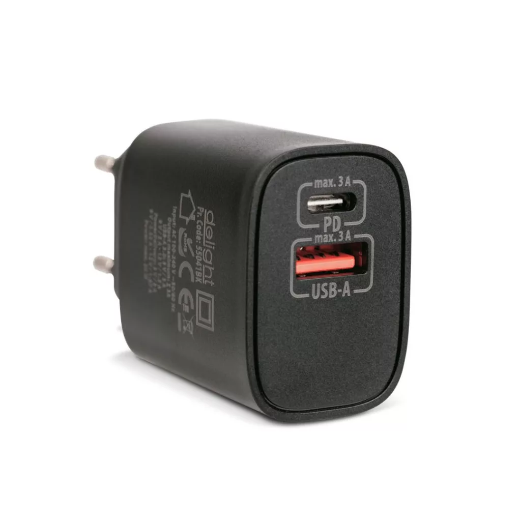 Adapter, 1xUSB-A, 1xUSB-C, 5V/9V/12V, 3A, 20W, PD, Black