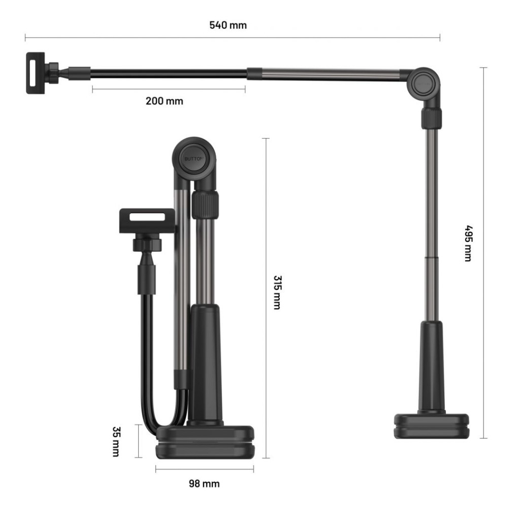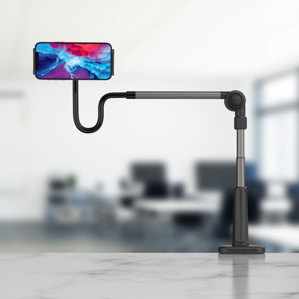Minden 7-13 hüvelykes készülékhez használható. A gyorsrögzítő rendszerrel, belső párnázással és 360°-ban forgatható fejjel ellátott fogó tökéletesen alkalmas a rögzítésre. A tartó karja kiváló minőségű alumíniumból készült, és több állítható részből áll. Két különböző magasságban állítható és rögzíthető, szükség szerint dönthető, a hattyúnyak segítségével pedig az utolsó részt is beállíthatjuk úgy, hogy a tablet vagy a telefon jól látható legyen.