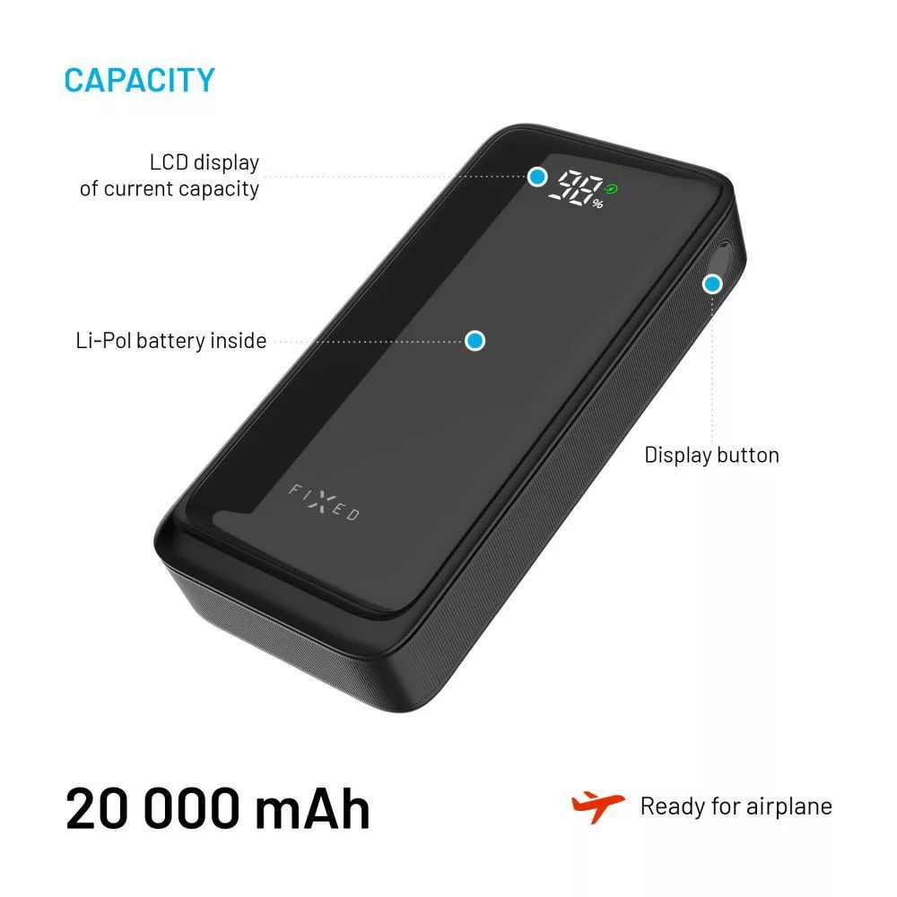 A FIXED Zen2 20 power bank megbízható tartalék áramforrás, ideális utazáshoz és mindennapi használatra. A 20 000 mAh kapacitással megbízhatóan tölti telefonját, fejhallgatóját, óráját vagy más eszközeit. A két USB-A és egy USB-C portnak köszönhetően akár három eszköz egyidejű töltését is lehetővé teszi. Az USB-C port támogatja a Power Delivery 3.0 gyors töltést is, akár 20 W-os teljesítménnyel, amely automatikusan elindul, amikor az eszköz csatlakoztatva van. Az elegáns fényes felületű, tiszta LCD-kijelző tájékoztat az aktuális kapacitás állapotáról. Maga a powerbank az USB-C porton keresztül könnyedén feltölthető akár 18 W-os teljesítménnyel, még akkor is, ha a powerbank éppen egy másik eszközt tölt. Kompakt méreteinek és kis súlyának köszönhetően a FIXED Zen2 20 power bank könnyedén elfér bármelyik kézitáskában vagy hátizsákban. Ezért ideális útitárs, amely bárhol és bármikor áramot biztosít eszközeidnek.