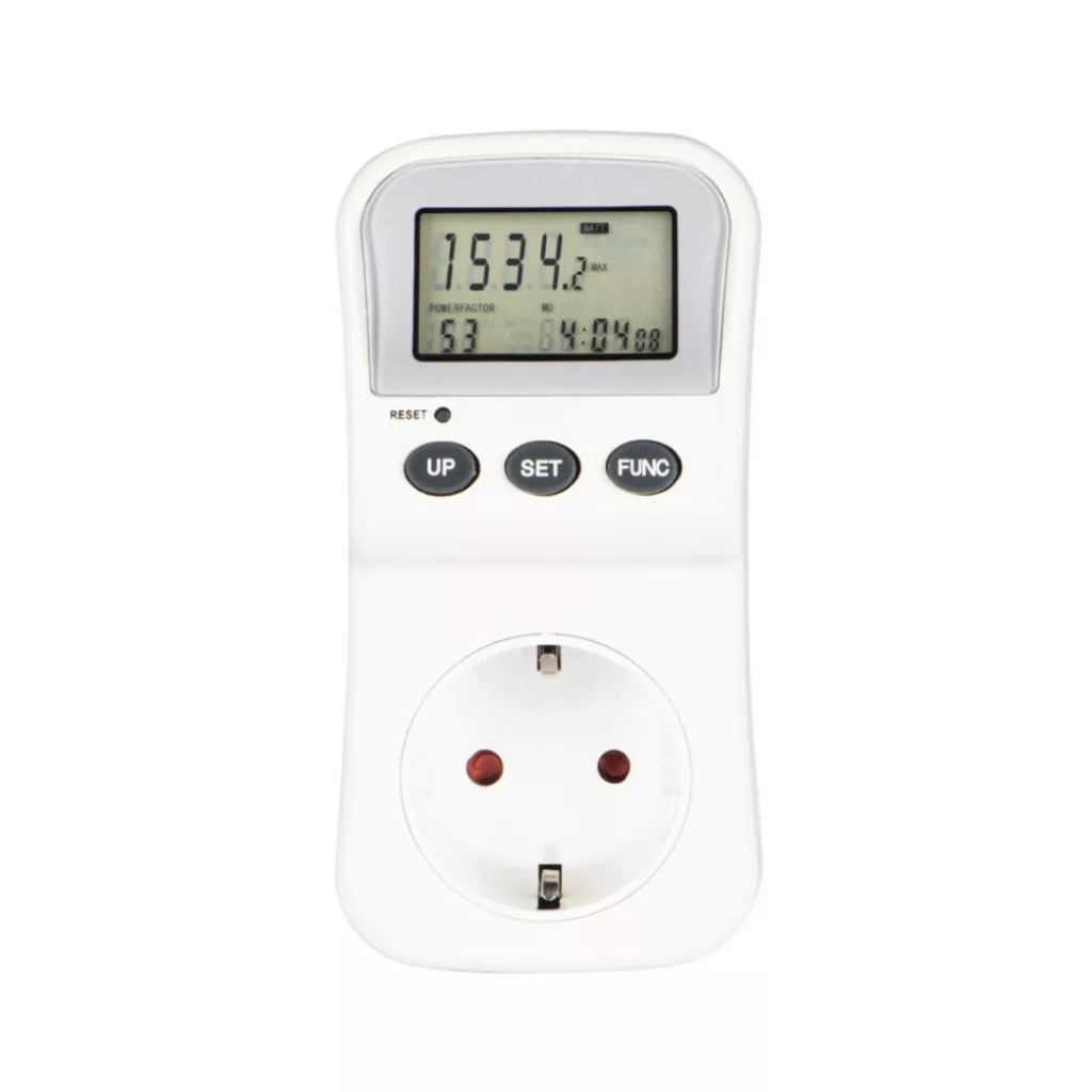 Mérési opciók: idő, feszültség, frekvencia, áram, teljesítménytényező, (min. és max.) teljesítmény és energiamennyiség