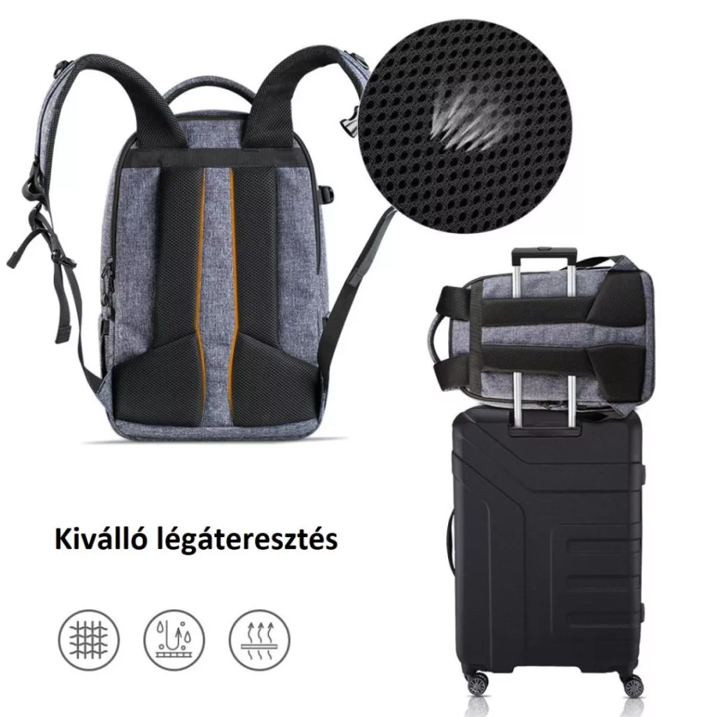 Lélegző légáteresztő léghálós pántok és ergonomikus, jól párnázott hátsó rész hűvösen és kényelmesen tartja Önt; Állítható mellkasi öv szorosan tartja a pántokat a vállán, hogy csökkentse a súlyt; Utazáskor a hátsó részen keresztül könnyen felszerelhető egy húzható dobozra is.