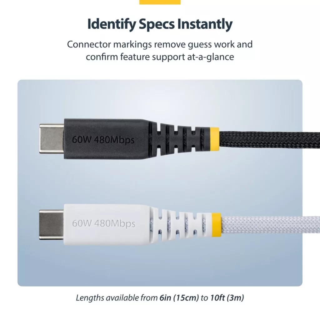 Csatlakoztasson töltőt vagy hubot egy USB PD-kompatibilis eszközhöz ezzel a strapabíró USB-C kábellel, amely akár 60 W teljesítményt és 3 A kimeneti áramot biztosít a gyors töltéshez. Az egyes csatlakozók egyértelmű jelölései kiküszöbölik a zavart, így azonnal azonosíthatja a megfelelő kábelt. Nincs többé találgatás a hasonló vagy jelöletlen USB-C kábelek között.