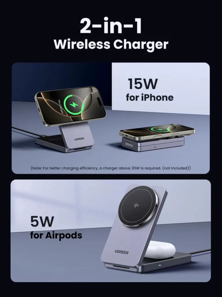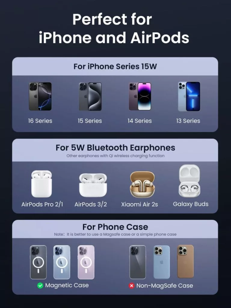 Univerzális kompatibilitás: iPhone 12-től 16-ig, AirPods, Galaxy Buds és Qi-kompatibilis eszközökkel együttműködik. Mágneses tartóval vagy tok nélküli telefonnal a legjobb eredményért.