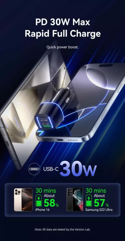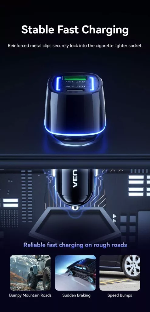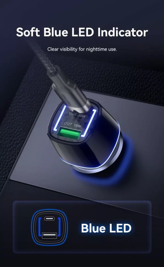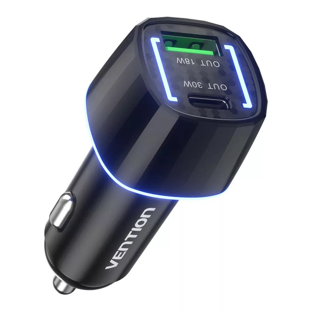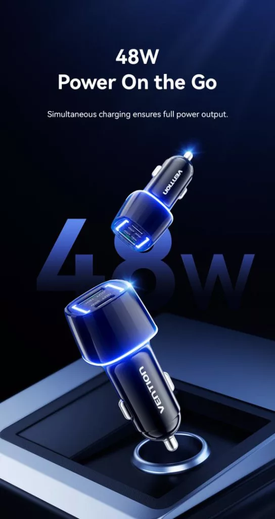 Vention FFRB0 autós töltő 48W. Kompatibilis az autókkal, és USB és USB-C csatlakozókkal rendelkezik. A csatlakozó típusa EU csatlakozó.