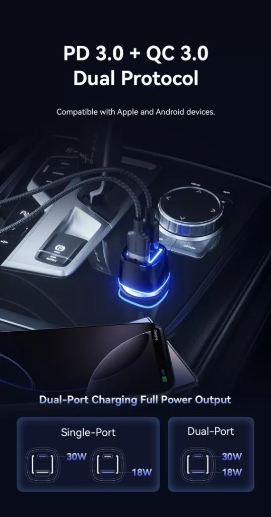 Autós töltő, 1xUSB-A, 1xUSB-C, 5V/9V/12V/15V/20V, 3A, 48W, QC, Black