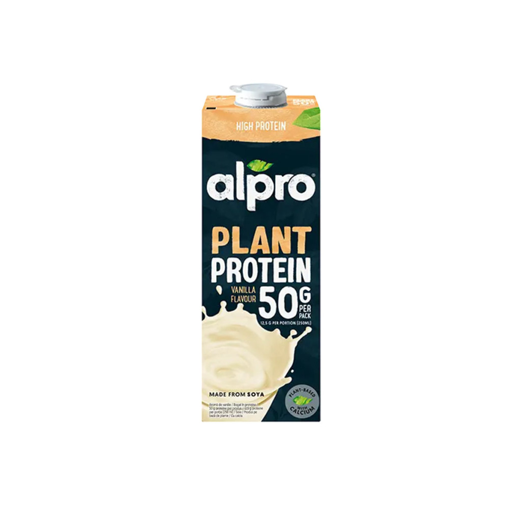 Alpro Plant Protein csokoládé ízű, növényi alapú ital. Szójaital hozzáadott kalciummal és vitaminokkal, magas fehérjetartalommal, borsófehérjével.Összetevők: ivóvíz, hántolt szójabab(13,1%), cukor, savanyúságot szabályozó anyagok (kálium-foszfátok), kalcium (kalcium-karbonát), aromák, tengeri só, stabilizátor (gellángumi), B2-vitamin, B12-vitamin, D2-vitamin.Átlagos tápérték 100g termékben:Energia: 281/67Zsír: 2,9 Amelyből telített zsírsavak: 0,5 Szénhidrát: 4,8 Amelyből cukrok: 4,8 Fehérje: 5 Rost: 0,9 Só: 0,12
