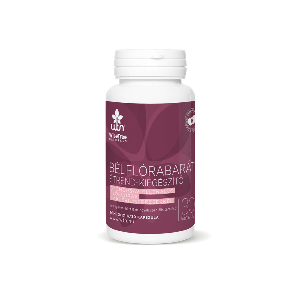 Gyomorsav-ellenálló élőflórás baktériumtörzsekkel!Hűtést és egyéb speciális tárolást nem igényel!Az emésztőrendszer megfelelő állapota alapvető az egészség fenntartásához, mert hatással van az egész szervezet működésére!Számos olyan termék kapható a piacon, amely többféle baktériumtörzset és több millió baktériumot tartalmaz. Ezek a termékek többségében csak akkor maradnak hatékonyak, ha hűtve tárolják őket! Hűtés nélkül a baktériumok nagy része már tárolás közben elhalhat. További jelentős hányaduk károsodhat a gyomor- és epesavak aktivitása által.Miben különleges a WTN Bélflórabarát étrend-kiegészítő készítménye?A benne lévő baktériumtörzseket egy speciális arányban tartalmazza, ami által megfelelően támogatja a mikrobiális egyensúlyt a gyomor-bél traktusban.Gyomor és epesav-ellenálló, így biztosan eljut oda, ahová kell.Elősegíti az egészséges gyulladásos választ.Fontos szerepet játszik a bélrendszerhez kapcsolódó limfoid szövet (GALT) egészségében.A hozzáadott almapektin, fehérmályva-gyökér koncentrátum és kvercetin tovább fokozza az emésztőrendszerre gyakorolt jótékony hatást.Szobahőmérsékleten tárolható, nem igényel hűtést!Színezék és tartósítószer-mentes termék.Antibiotikummal együtt szedhető.A WTN Bélflórabarát étrend-kiegészítő szedésének előnyei:hozzájárulhat a bélrendszer egészségének megőrzéséhezlétrehozza a baktériumok megfelelő egyensúlyát a bélrendszerbenhatására javulhat az emésztés, csökkenhetnek az emésztési tünetekjavulhat a tápanyagok felszívódásaa bél nyálkahártyája megfelelő állapotba hozhatóhatékonyabbá válhat az immunrendszer működéseHatóanyag/1 kapszula:Élőflórás baktériumtörzsek Bacillus clausii Bacillus subtilis Bacillus coagulans4,15 milliárd CFU*Organikus gumiarábikum, fehérmályva-gyökérkoncentrátum, kvercetin (japánakác-virágkivonatból)455 mg *Aktív kolonizáló egység.Összetevők: organikus gumiarábikum, fehérmályva-gyökér koncentrátum, zselatin (kapszulahéj), kvercetin, bacillus clausii, bacillus subtilis, bacillus coagulans.Adagolás: Ajánlott mennyiség: napi 1 kapszula, lehetőség szerint az esti órákban.Kúraszerű használata javasolt!Figyelmeztetés: Az étrend-kiegészítő fogyasztása nem helyettesíti a kiegyensúlyozott, változatos, vegyes étrendet és az egészséges életmódot. Az ajánlott napi mennyiséget ne lépje túl! A készítményt gyermekektől elzárva kell tartani száraz, hűvös, sötét helyen. Laktáció és terhesség alatt fogyasztása nem javasolt. Gyermekek nem használhatják. Ha bármely termékösszetevőre allergiás, túlérzékeny vagy, ne használd a terméket! Nagyon javasolt az étrend-kiegészítők szedését elkülöníteni a kávé fogyasztásától. Legalább fél órával a kávé fogyasztása előtt vagy kávé fogyasztása után min. 2 óra múlva célszerű bevenni. Fennálló egészségügyi probléma esetén konzultálj kezelőorvosoddal! Használata kúraszerűen javasolt, amennyiben a kezelőorvosod, természetgyógyászod nem javasolta másképp.