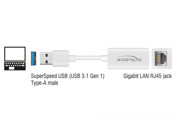DeLock SuperSpeed USB3.2 Type-A male > Gigabit LAN 10/100/1000 Mbps compact Adapter White
