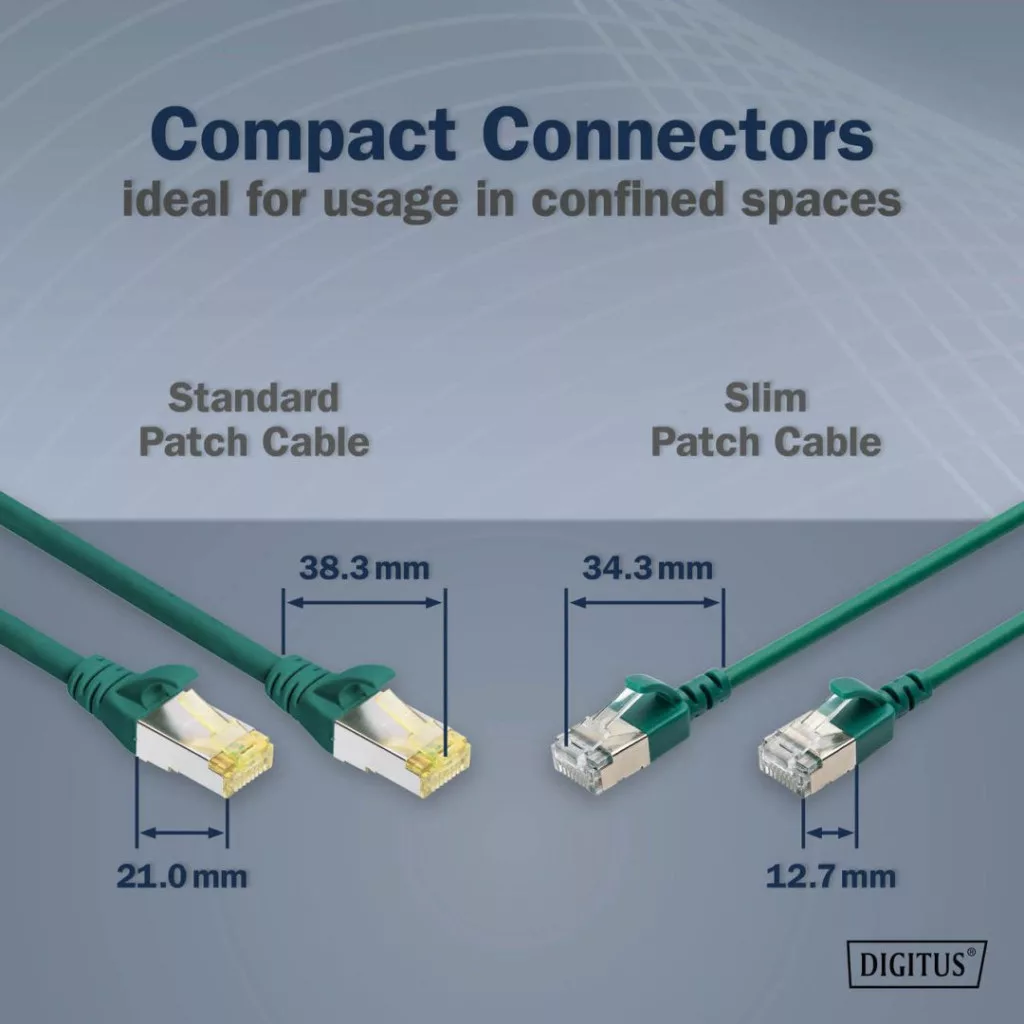 A DIGITUS® Slim patch kábeleket kis külső átmérőjük és rugalmas köpenyük jellemzi. A vékony kialakítás sokoldalú felhasználást tesz lehetővé a hálózatban. A DIGITUS® Slim patchkábelek emellett az ISO/IEC 11801 és a DIN EN 50173 CAT 6A szabványoknak megfelelően készülnek. Garantálják, hogy a kábelszerelés megfelel az ISO és EN csatornaspecifikációnak, és kiváló teljesítményt nyújtanak a DIGITUS® CAT 6A kábelezésben. A teljesítményt 500 MHz-ig tesztelték, beleértve az olyan jellemzőket is, mint a közeli keresztbeszólás ("NEXT"). A DIGITUS® patch kábeleket kifejezetten úgy fejlesztették ki, hogy megfeleljenek a különböző alkalmazási területek összes követelményének. Mindegyik kábelt húzáscsökkentővel ellátott, öntött gyűrődésgátló hüvelynel látták el. Ezenkívül a hüvelyben van egy reteszelőkar-védelem, amely megakadályozza, hogy a kábel elgörbüljön, és a reteszelőkar letörjön a dugóról.